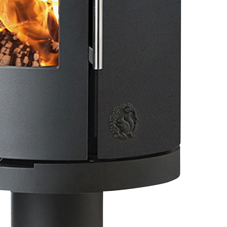 Morsø 7349 en brændeovn, der rejser sig elegant på den runde piedestal. Det spektakulære flammebillede sætter markant præg på omgivelserne og piedestalen giver ovnen et let og svævende udtryk.