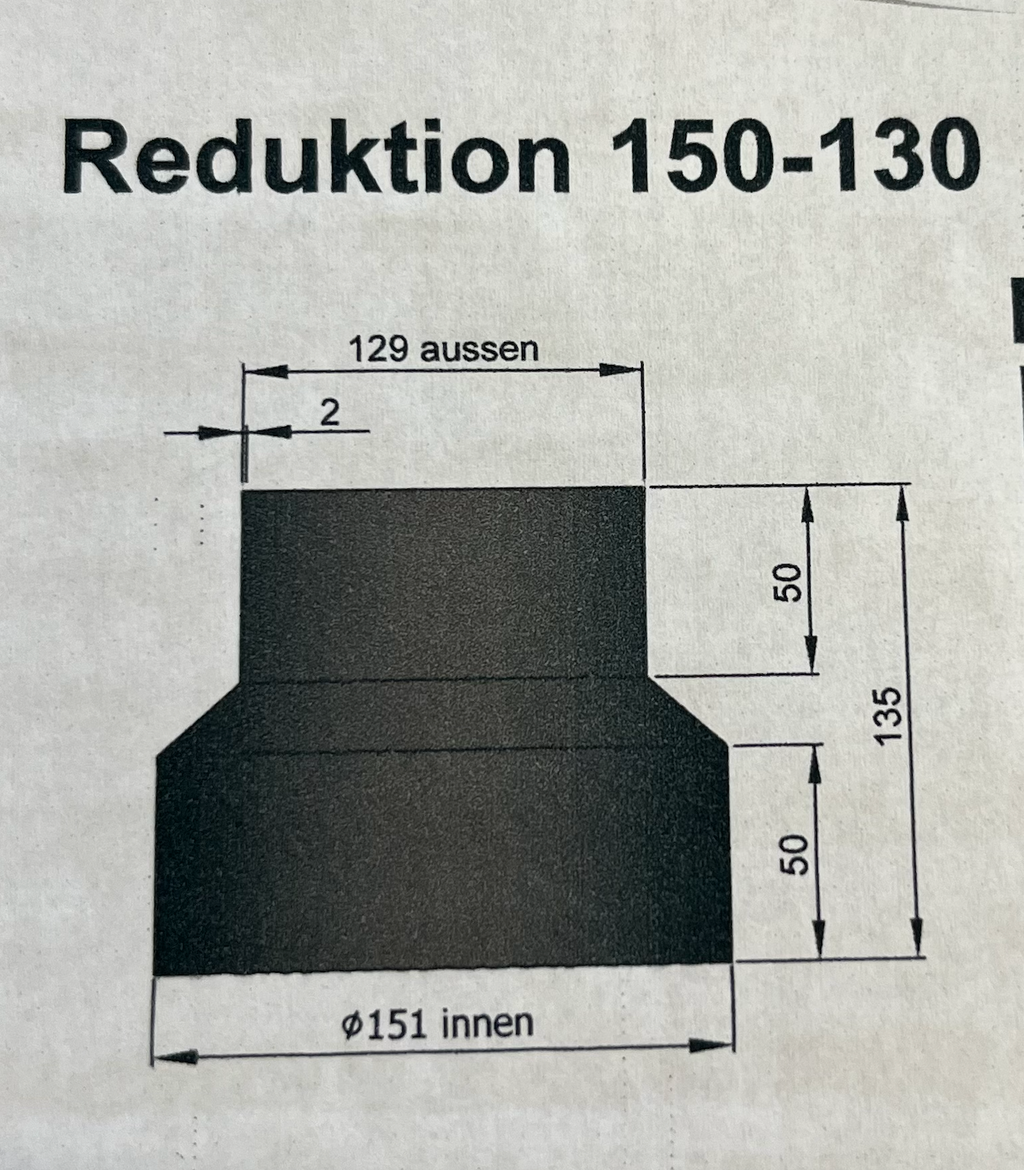 For en reduktion med en diameter på Ø150/130 mm er den indvendige og udvendige diameter i toppen Ø151/155 mm, mens den indvendige og udvendige diameter i bunden er Ø125/129 mm.