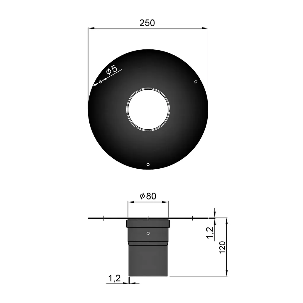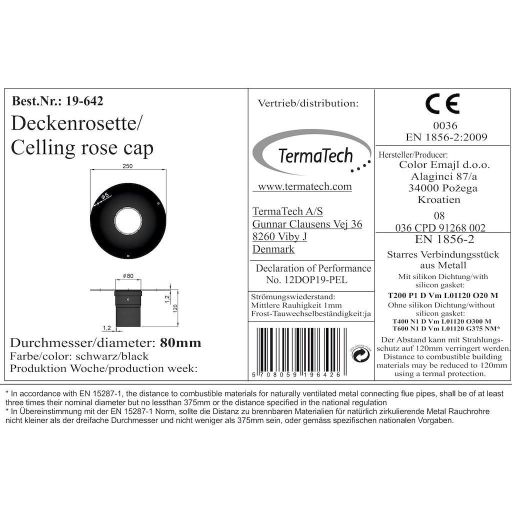 Stilren rosette fra TermaTech, designet til Ø80 mm røgrør og leveret med muffe med Unico-bøsning. Rosetten har en diameter på Ø250 mm og giver en flot og ren afslutning ved gennemføring af stålskorstenen gennem tag eller tilstødende rum.