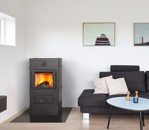 Svendsen 1 Grundmodel brændeovnen med 14cm sokkel er både et elegant møbel og en meget effektiv varmekilde.