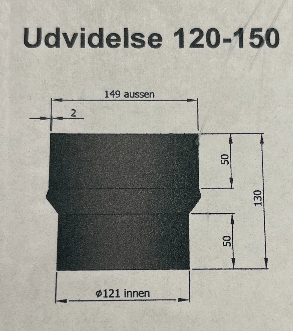 Udvidelse til røgrør med forskellige diametermål. Her er specifikationer for de forskellige størrelser: