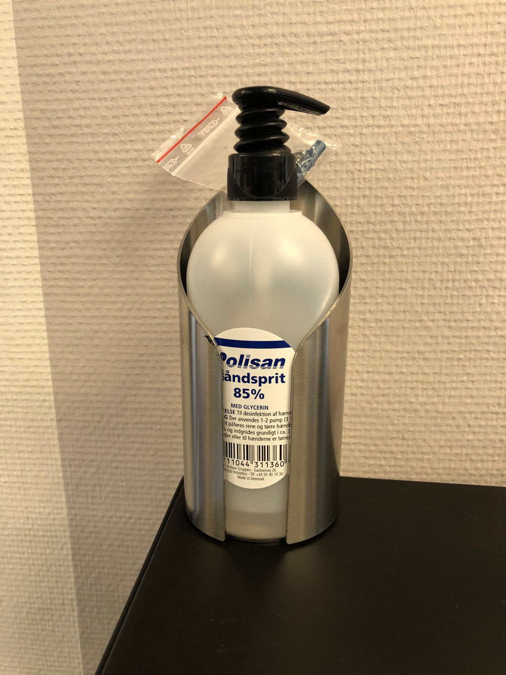 Hållaren beställs inklusive 1 x 500 ml. Polisan handsprit med pump, som kan återfyllas.