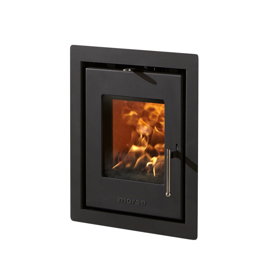Ugnsluckan är tillverkad av det välkända Morsø-kvalitetsgjutjärnet, medan den omgivande ramen finns i mörk antracitgrått eller borstat stål.
