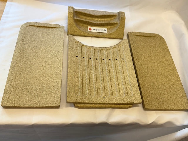 Skamol-set är tillverkade av vermikulit, ett speciellt stengranulat som har pressats ihop under högt tryck. Denna process ger vermikulitskivorna deras unika egenskaper som brandsäkerhet och värmehållning. Skivorna ser ut som spånskivor och kan vara lite ömtåliga. Eftersom materialet är poröst bör det hanteras varsamt. Du bör inte kasta ved i förbränningskammaren, eftersom det kan orsaka att skivorna går sönder. Det spelar ingen roll om skivorna har sprickor, men om sprickorna är större än ca 5 mm, eller om bitar av dem går sönder, är det viktigt att byta ut dem.